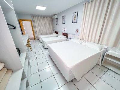 Apartamento com ambiente único, 1 cama de casal, 2 camas de solteiro e 1 banheiro